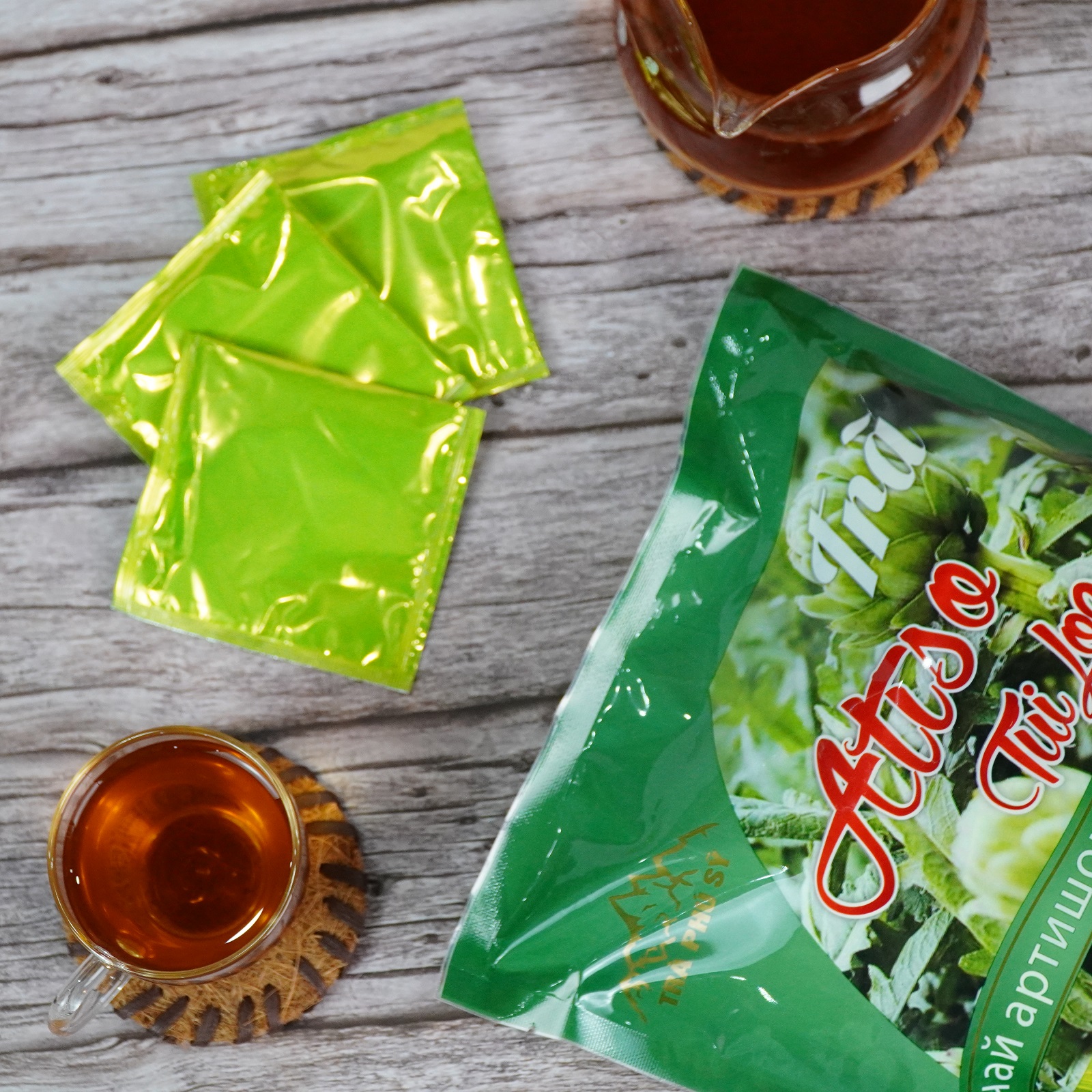 Loại trà được chế biến từ hoa, lá hoặc rễ cây atiso (Cynara scolymus), đóng gói dưới dạng túi lọc tiện lợi. Trà có hương vị thanh mát, hơi đắng nhưng dễ uống, mang lại nhiều lợi ích cho sức khỏe.